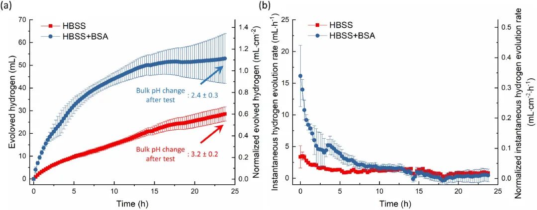 圖1 (a) CP Mg在HBSS和HBSS+BSA中浸泡24小時(shí)的析氫曲線,(b)依據(jù)(a)計(jì)算的瞬時(shí)析氫速率