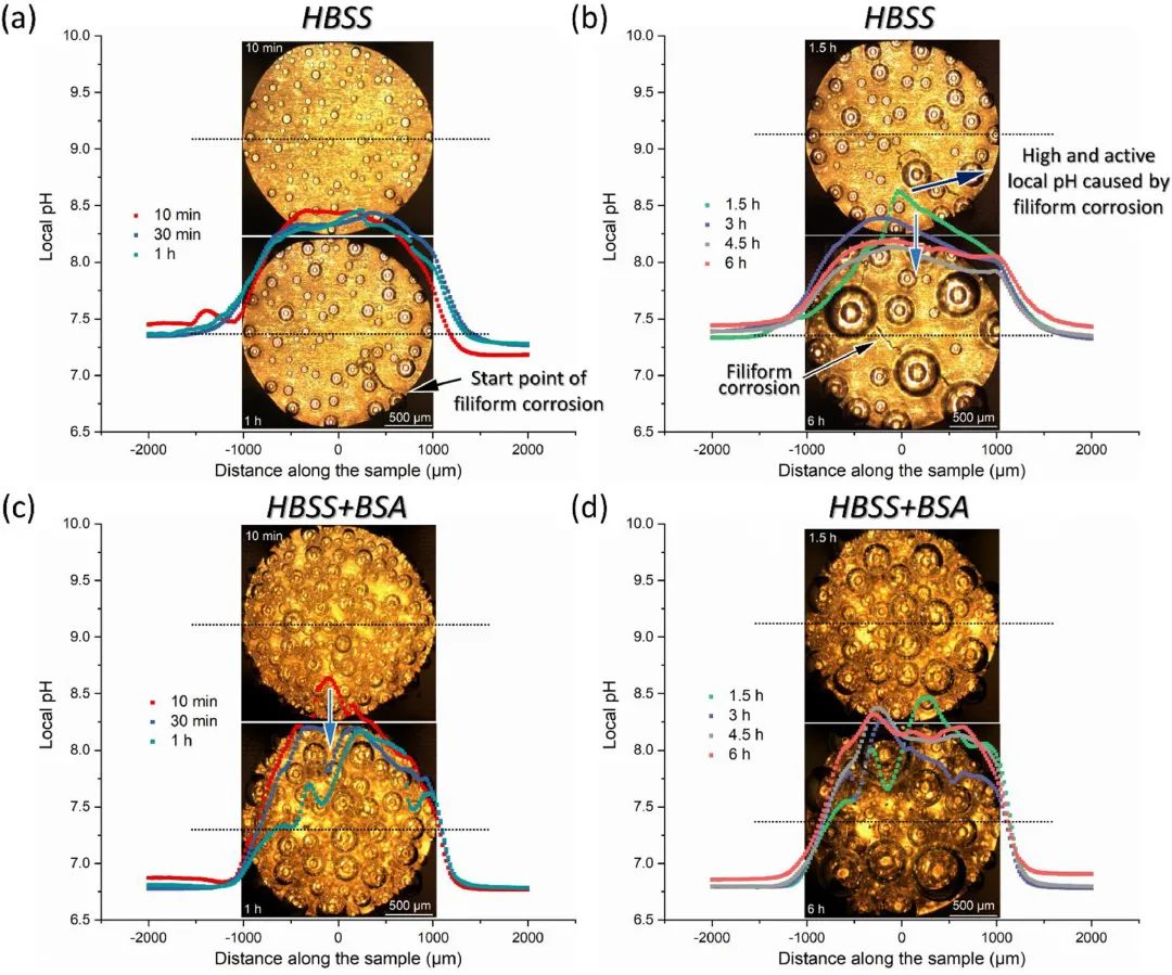 圖2 浸入(a, b) HBSS中的CP Mg表面50 μm處的局部pH測(cè)量(線掃描),(c, d) 浸入過(guò)程中的HBSS+BSA中的CP Mg表面50 μm處的局部 pH測(cè)量(線掃描)。所有測(cè)量均在流體動(dòng)力學(xué)條件下進(jìn)行,流速為1.0 mL/min。光學(xué)顯微照片顯示了測(cè)試過(guò)程中兩個(gè)樣品的視覺(jué)外觀
