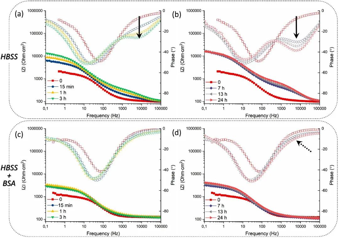 圖3 在HBSS (a, b)和HBSS+BSA (c, d)中浸泡24小時(shí)期間CP Mg的交流阻抗Bode圖演變