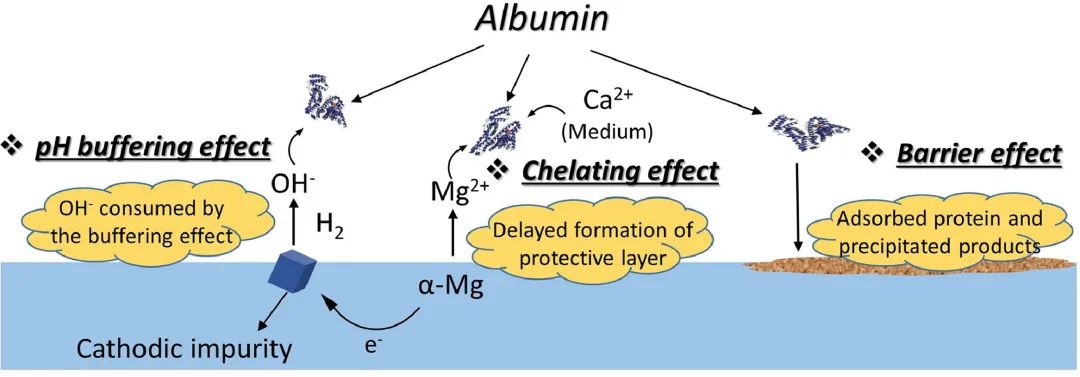 最近,來(lái)自德國(guó)亥姆霍茲聯(lián)合會(huì)吉斯達(dá)赫特材料及海岸研究中心的梅迪博士(現(xiàn)為鄭州大學(xué)講師)、Sviatlana Lamaka博士與Mikhail Zheludkevich教授等人綜合運(yùn)用析氫測(cè)試、失重測(cè)試、微區(qū)pH監(jiān)控、原位連續(xù)阻抗監(jiān)控等手段研究了純鎂在含牛血清白蛋白(BSA)的Hank’s平衡鹽溶液(HBSS)中的腐蝕行為,重點(diǎn)探討了白蛋白對(duì)純鎂腐蝕行為的影響機(jī)制。結(jié)果發(fā)現(xiàn),白蛋白對(duì)鎂腐蝕行為的影響主要包含吸附作用、Ca2+/Mg2+絡(luò)合作用和pH緩沖作用等三種機(jī)制。這項(xiàng)工作加深了對(duì)復(fù)雜偽生理環(huán)境中鎂腐蝕降解行為的理解。