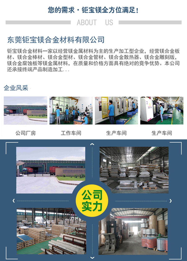 東莞市鉅寶鎂合金材料有限公司是一家專業(yè)從事鎂合金系列產(chǎn)品的研發(fā)、生產(chǎn)、銷售為一體的企業(yè),多年來,在同行業(yè)和消費(fèi)者的心中了贏得非常值得信賴的口碑,本司主要產(chǎn)品有:鎂合金板、鎂合金管、鎂合金棒、鎂合金型材、鎂豆、鎂絲、蝕刻板、雕刻板、及鎂合金機(jī)加工產(chǎn)品,主要應(yīng)用于:航天、軍工、軌道、交通、新能源汽車、智能制造、3C等各種領(lǐng)域,我司的產(chǎn)品暢銷美、歐、日、韓等各國,另外我司還通過了ISO9001:2015國際質(zhì)量管理體系認(rèn)證,擁有規(guī)范和完善的質(zhì)量體系,公司秉承“誠信、專業(yè)、共贏”的經(jīng)營理念,堅(jiān)持用戶至上,以優(yōu)質(zhì)的服務(wù)來服務(wù)好每一位客戶,堅(jiān)持技術(shù)上不斷創(chuàng)新、不斷超越,用我們的優(yōu)質(zhì)服務(wù)以及專業(yè)技術(shù)為客戶提供產(chǎn)品的后續(xù)表面處理及售后服務(wù)。