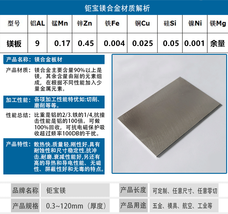 東莞市鉅寶鎂合金材料有限公司是一家專業(yè)從事鎂合金系列產(chǎn)品的研發(fā)、生產(chǎn)、銷售為一體的企業(yè),多年來,在同行業(yè)和消費者的心中了贏得非常值得信賴的口碑,本司主要產(chǎn)品有:鎂合金板、鎂合金管、鎂合金棒、鎂合金型材、鎂豆、鎂絲、蝕刻板、雕刻板、及鎂合金機加工產(chǎn)品,主要應(yīng)用于:航天、軍工、軌道、交通、新能源汽車、智能制造、3C等各種領(lǐng)域,我司的產(chǎn)品暢銷美、歐、日、韓等各國,另外我司還通過了ISO9001:2015國際質(zhì)量管理體系認證,擁有規(guī)范和完善的質(zhì)量體系,公司秉承“誠信、專業(yè)、共贏”的經(jīng)營理念,堅持用戶至上,以優(yōu)質(zhì)的服務(wù)來服務(wù)好每一位客戶,堅持技術(shù)上不斷創(chuàng)新、不斷超越,用我們的優(yōu)質(zhì)服務(wù)以及專業(yè)技術(shù)為客戶提供產(chǎn)品的后續(xù)表面處理及售后服務(wù)。