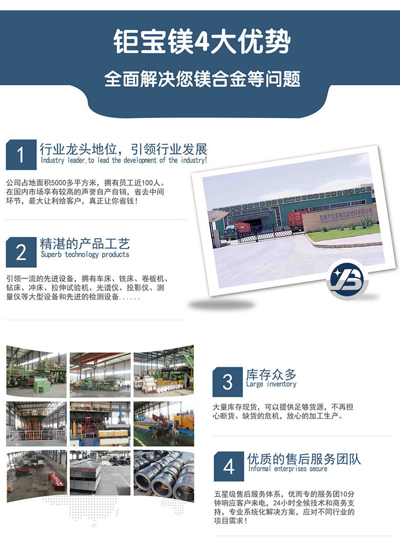 東莞市鉅寶鎂合金材料有限公司是一家專業(yè)從事鎂合金系列產(chǎn)品的研發(fā)、生產(chǎn)、銷售為一體的企業(yè),多年來,在同行業(yè)和消費者的心中了贏得非常值得信賴的口碑,本司主要產(chǎn)品有:鎂合金板、鎂合金管、鎂合金棒、鎂合金型材、鎂豆、鎂絲、蝕刻板、雕刻板、及鎂合金機加工產(chǎn)品,主要應用于:航天、軍工、軌道、交通、新能源汽車、智能制造、3C等各種領(lǐng)域,我司的產(chǎn)品暢銷美、歐、日、韓等各國,另外我司還通過了ISO9001:2015國際質(zhì)量管理體系認證,擁有規(guī)范和完善的質(zhì)量體系,公司秉承“誠信、專業(yè)、共贏”的經(jīng)營理念,堅持用戶至上,以優(yōu)質(zhì)的服務(wù)來服務(wù)好每一位客戶,堅持技術(shù)上不斷創(chuàng)新、不斷超越,用我們的優(yōu)質(zhì)服務(wù)以及專業(yè)技術(shù)為客戶提供產(chǎn)品的后續(xù)表面處理及售后服務(wù)。